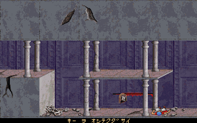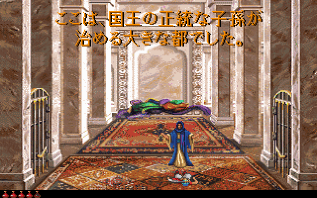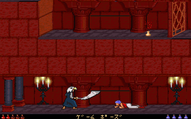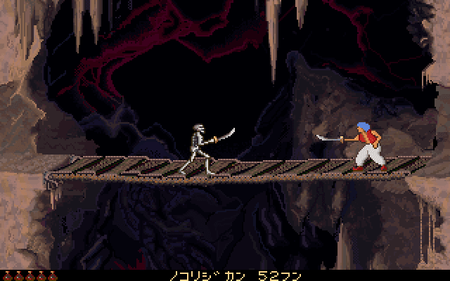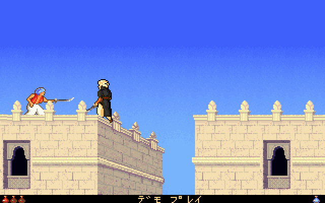 Here is the video game “Prince of Persia 2: The Shadow & The Flame”! Released in 1993 on DOS, it's still available and playable with some tinkering. It's an action game, set in a platform, middle east and puzzle elements themes and it was released on Mac, FM Towns and PC-98 as well.
