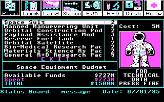 ...Spent a LOT of hours on this one when it came out. The fun thing to do was to hex edit a saved game, give yourself 255 of several modules, sell them back, and have enough cash to play the game as it should be: Unlimited funding to NASA with no dipshits like Proxmire or Senate page boy rapers like Mondale to screw up the agency's budget. Only sad part about the game/sim is that while you can build a station that loops around the Earth, you can't link the two ends together! Still, a fun waste of time, and I recommend it!