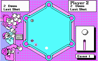 Pub Pool is a unique "coffee break" pool game from Mastertronic. In contrast to other serious pool simulations, the idea behind Pub Pool is simple: shoot six pool balls into each corner of a hexagonal pool table, using as few moves as possible. You play the game from a top-down perspective, using a simple but effective interface that lets you adjust the spin of your cue, the direction, etc.