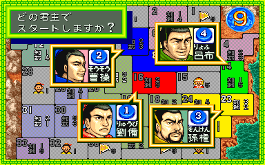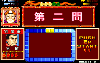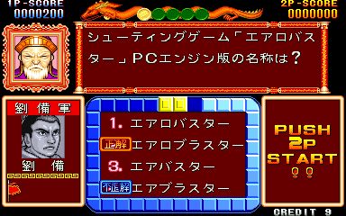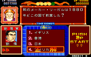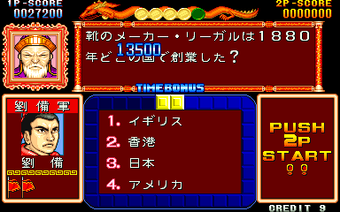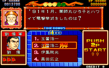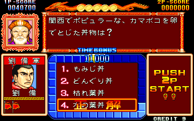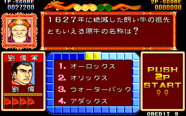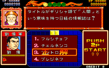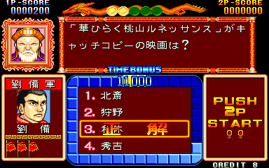 Here is the video game “Quiz Sangokushi: Chiryaku no Hasha”! Released in 1991 on Arcade, it's still available and playable with some tinkering. It's a strategy and simulation game, set in an anime / manga, game show / trivia / quiz and fantasy themes.