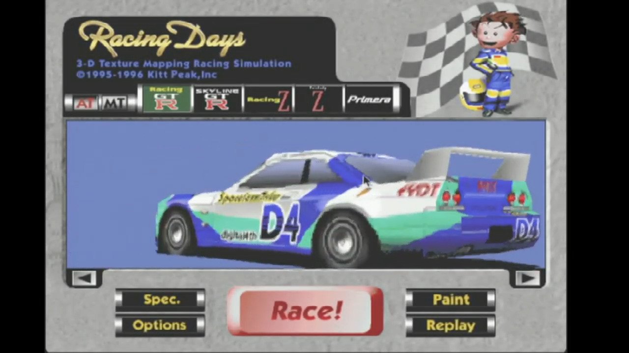 In 1995, Kitt Peak, Inc. publishes Racing Days on Mac. Also published on Pippin, this racing / driving and simulation game is abandonware and is set in a real-time, track racing and contemporary themes.