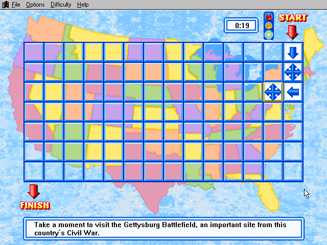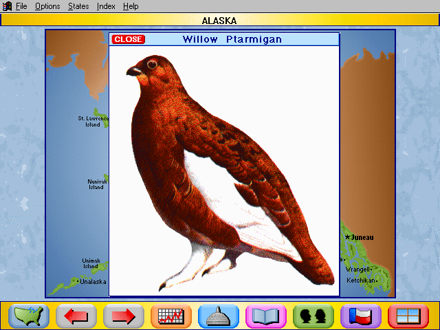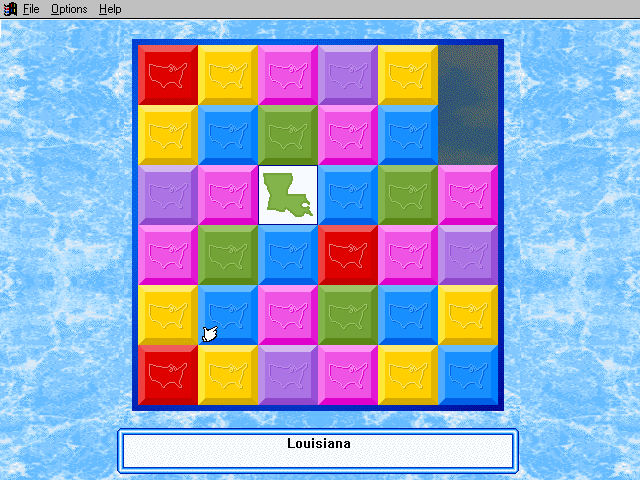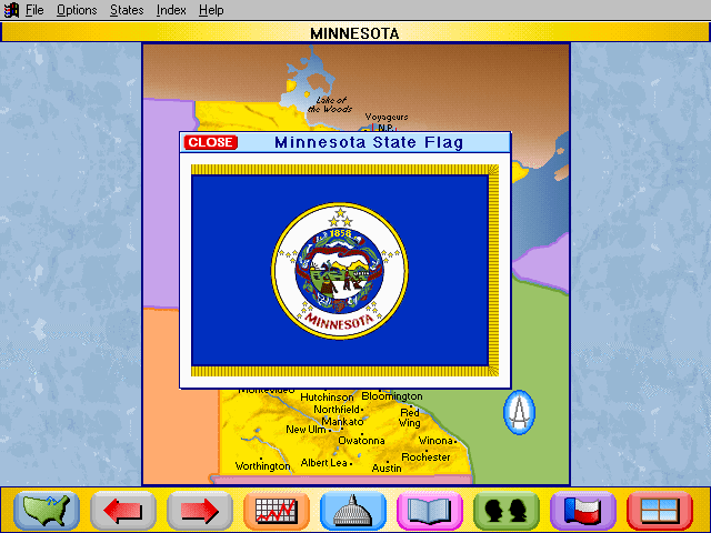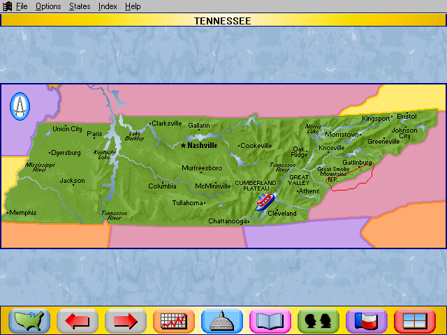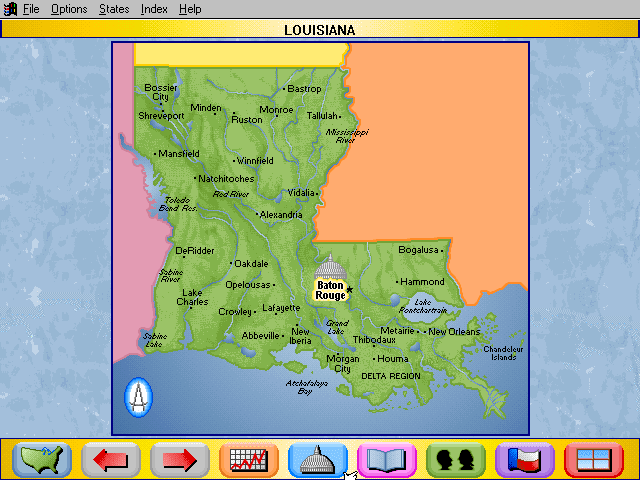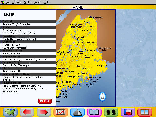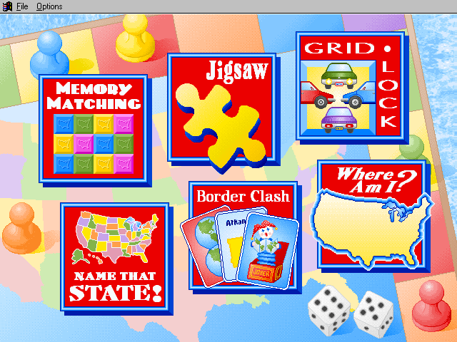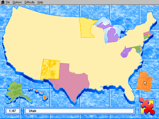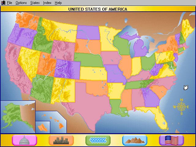 Here is the video game “Rand McNally Children's Atlas of the United States”! Released in 1994 on Windows 3.x, it's still available and playable with some tinkering. It's an educational game, set in a geography, north america and puzzle elements themes.