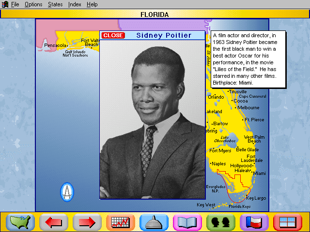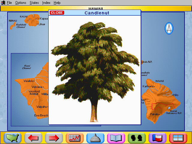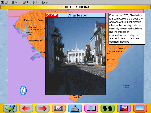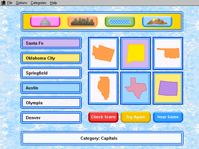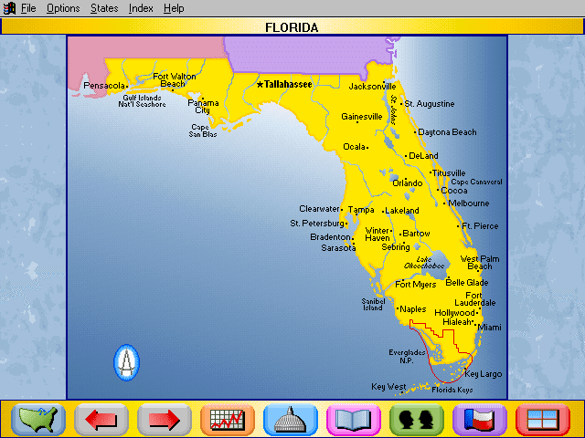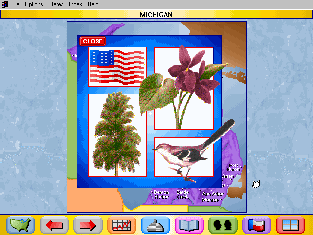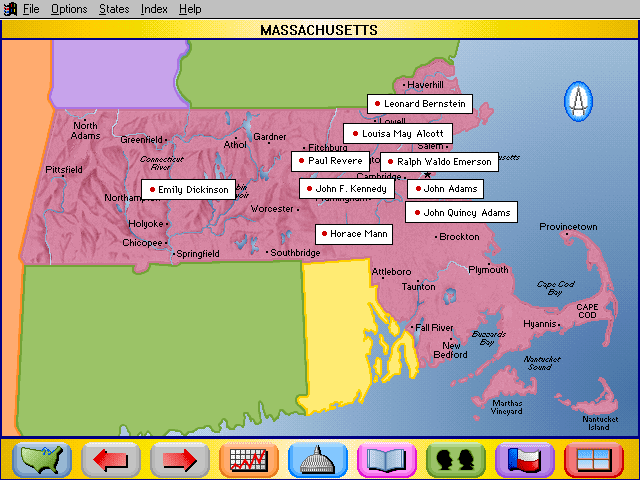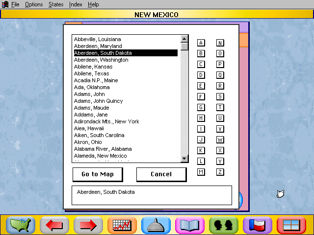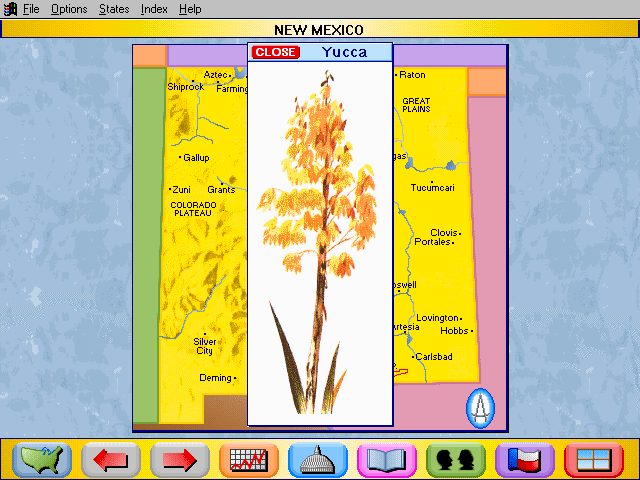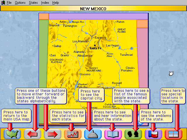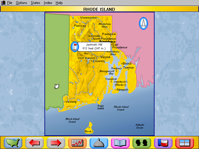 Here is the video game “Rand McNally Children's Atlas of the United States”! Released in 1994 on Windows 3.x, it's still available and playable with some tinkering. It's an educational game, set in a geography, north america and puzzle elements themes.