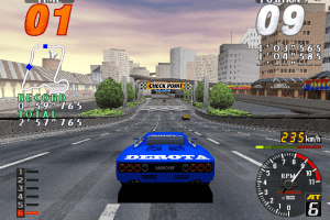 Here is the video game “Rave Racer”! Released in 1995 on Arcade, it's still available and playable with some tinkering. It's a racing / driving game, set in an arcade, vehicle simulator, automobile and track racing themes.