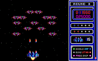 From description at MobyGames: "[Invasion] consists of 66 stages, arranged in some sort of pattern (for example, every type of bats you encounter takes 3 stages to pass, each of three introducing new challenges). Once every several bats you kill you get one of four bonuses - purple gems, 6 of which grant you another life, a green gem which makes your missiles faster, a red one which gives you additional missiles per round, or a white gem which grants you a time-limited "hyper" mode.