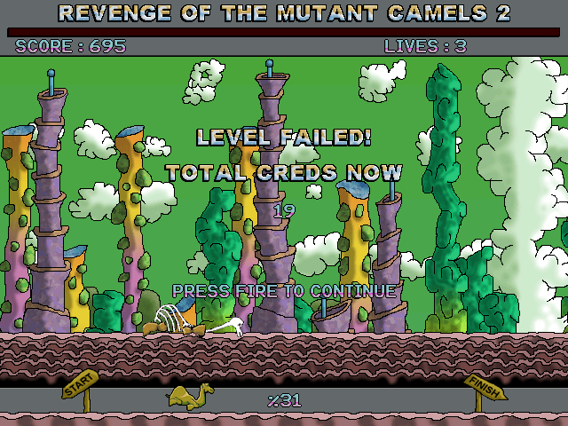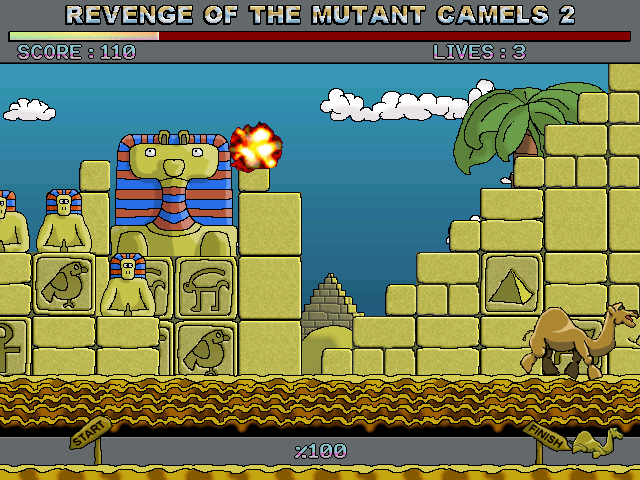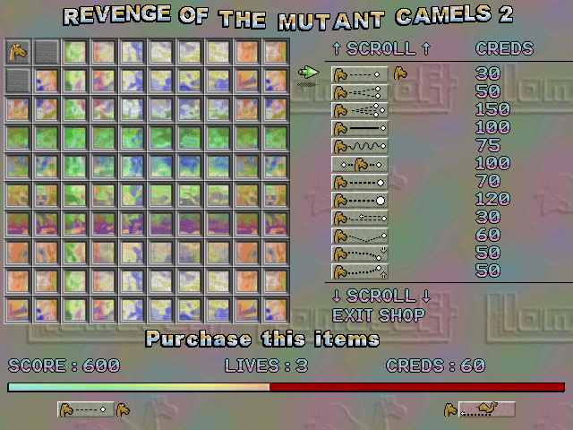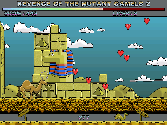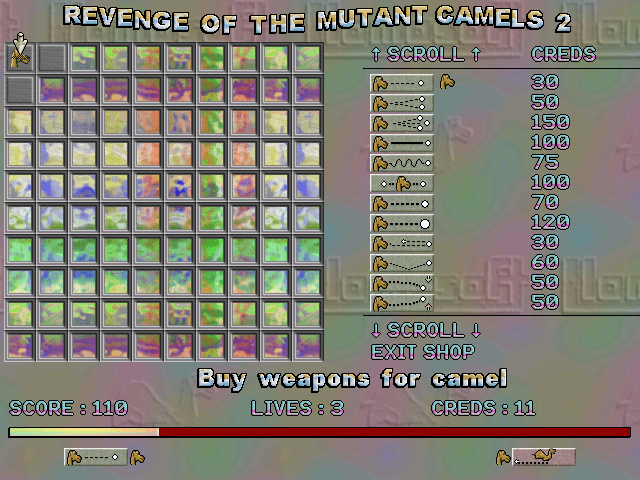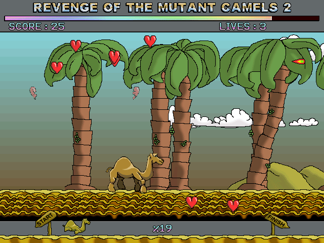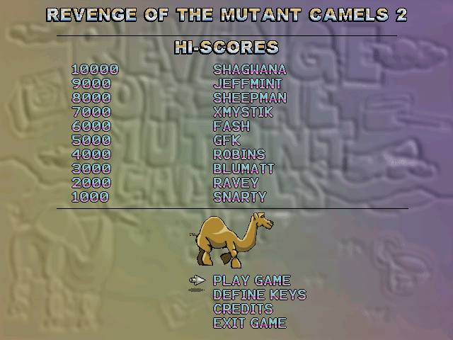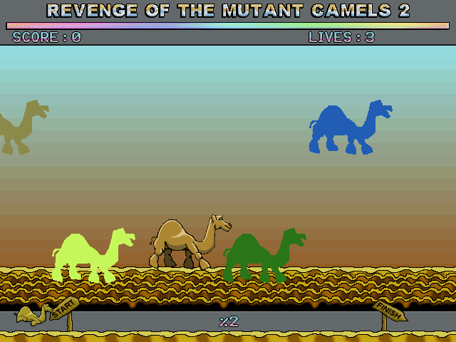 Revenge of the Mutant Camels II is a video game published in 2001 on Windows by Guildhall Leisure Services Ltd.. It's an action game, set in an arcade, fantasy and shooter themes.