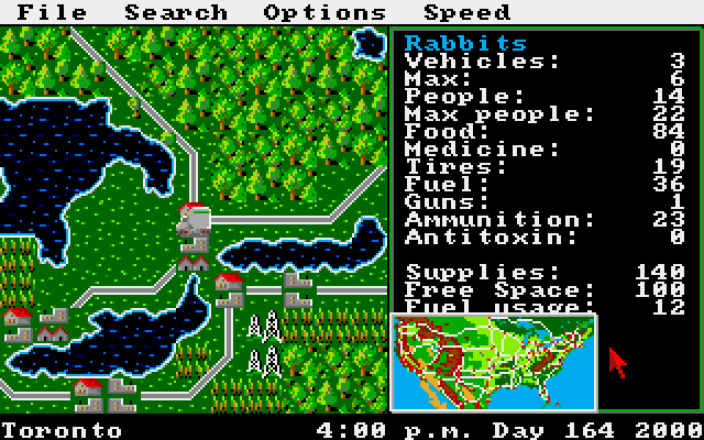 The plot is that in the year 1999 (which, I know, has already passed :) ) a terrorist group unleashes a deadly virus on the United States and the country collapses. You control a road gang that is trying to take over cities and survive the harsh world. Do well enough and you'll be contacted by the government and sent on a quest to find eight missing scientists and bring them back to a secret base. You move the gang around on a map of North America and have to loot cities for needed supplies, engage in gun battles with other gangs, and fight detailed tactical road battles to capture vehicles..