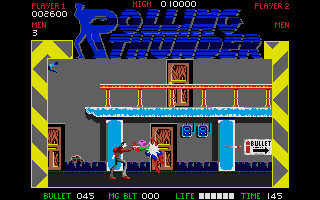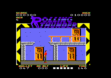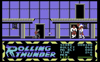 Here is the video game “Rolling Thunder”! Released in 1987 on Commodore 64, it's still available and playable with some tinkering. It's an action game, set in an arcade, shooter and platform themes and it was released on Amiga, Amstrad CPC, Arcade, Atari ST and ZX Spectrum as well.