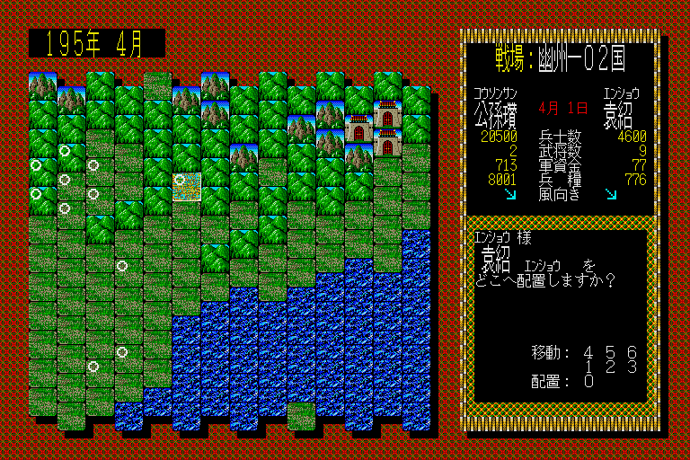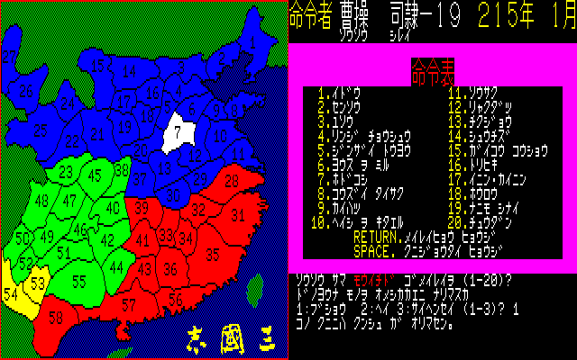 Romance of The Three Kingdoms 1 also boasts numerous other gameplay options that wonderfully capture the culture and society of China at the time: for instance, the number of your population and morale level determines how big an army you can raise, and improved irrigation and donations to the public are prerequisites to high harvest yields and happy townsfolk. You must also contend with natural disasters such as flood, locusts, and plague that can come without warning.