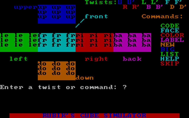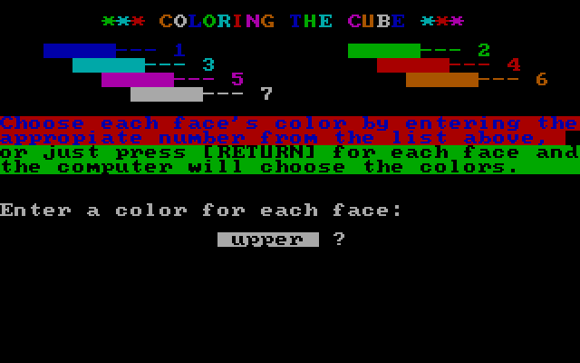 Due to limitations of the BASIC language and early 1980 hardware, the game amounts to little more than a quirky piece of PC nostalgia. From the MobyGames description: "Rubik's Cube is a simulation of the popular puzzle game. You are given a cube where each side is broken up into nine sections. Each section has a different color. Your goal is to arrange the cube so that all sections are the same color on each side of the cube by twisting the cube in various directions. The game uses keyboard commands to allow you to select a cube face and twisting direction. You start out with a properly ordered cube; can you scramble the colors and then get them back again?"