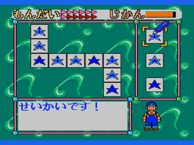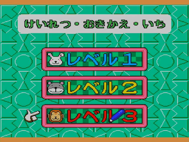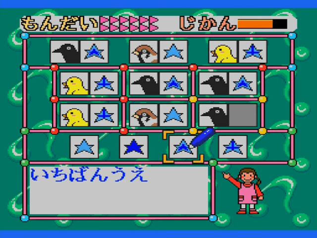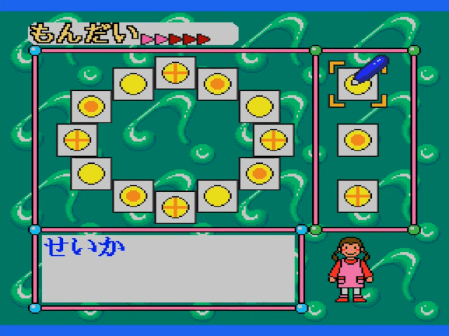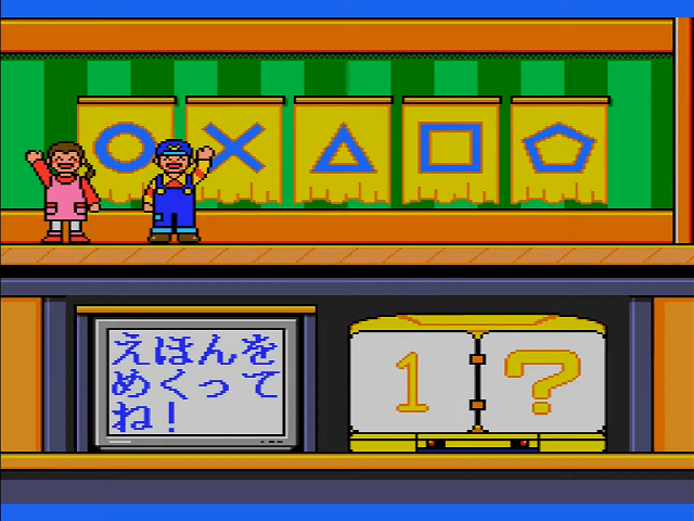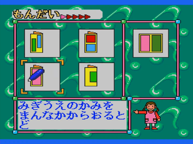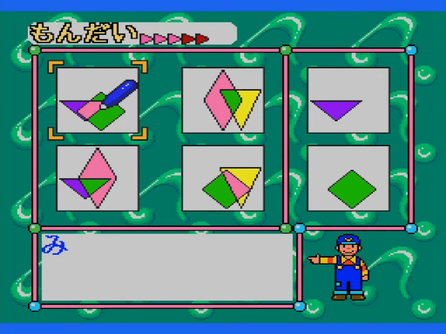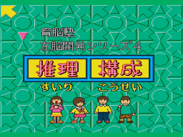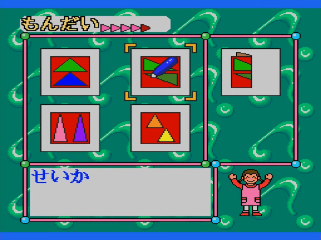 Here is the video game “Sanou Kaihatsu Series 4 Suiri - Kousei”! Released in 1995 on SEGA Pico, it's still available and playable with some tinkering. It's an educational game, set in a math / logic and mini-games themes.