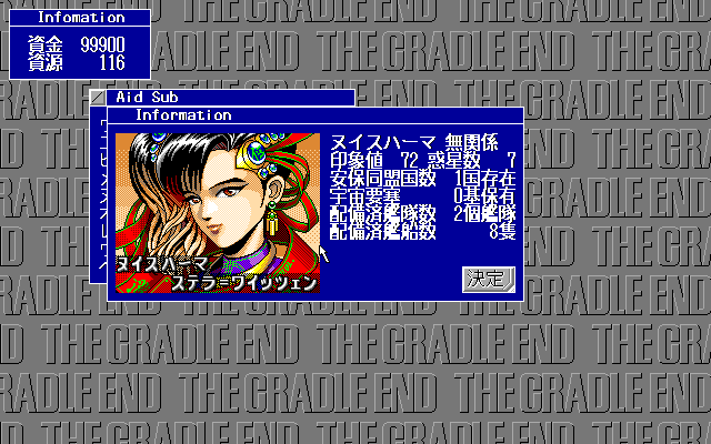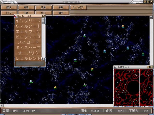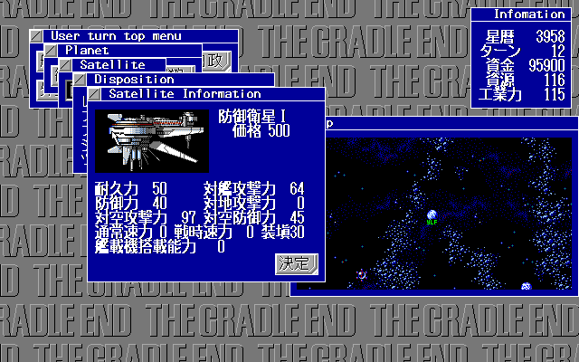 Schwarzschild IV: The Cradle End (aka シュヴァルツシルトⅣ THE CRADLE END) is a video game published in 2000 on Windows by Kogado Studio, Inc.. It's a strategy game, set in an anime / manga, sci-fi / futuristic, turn-based and space flight themes, and was also released on FM Towns and PC-98.