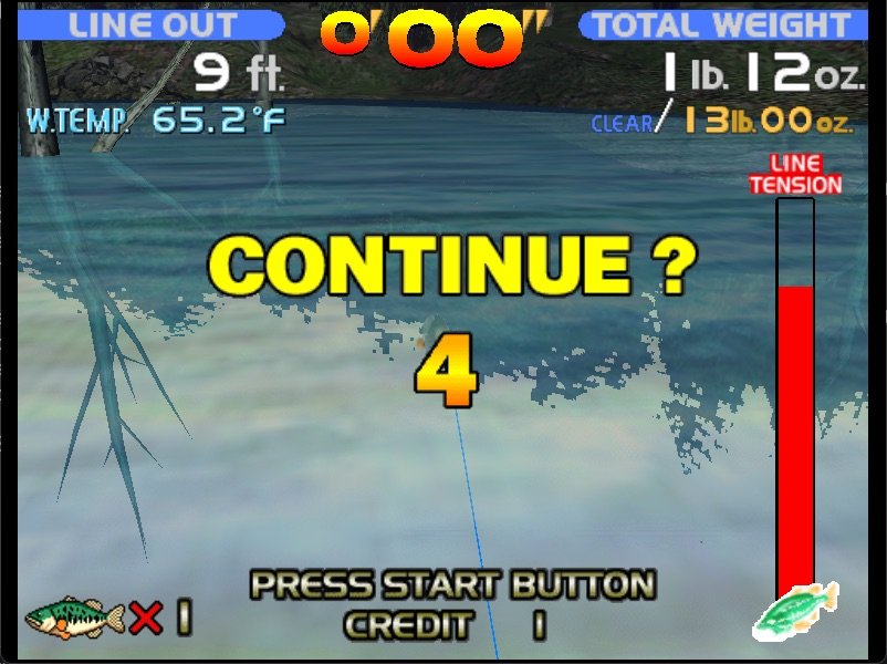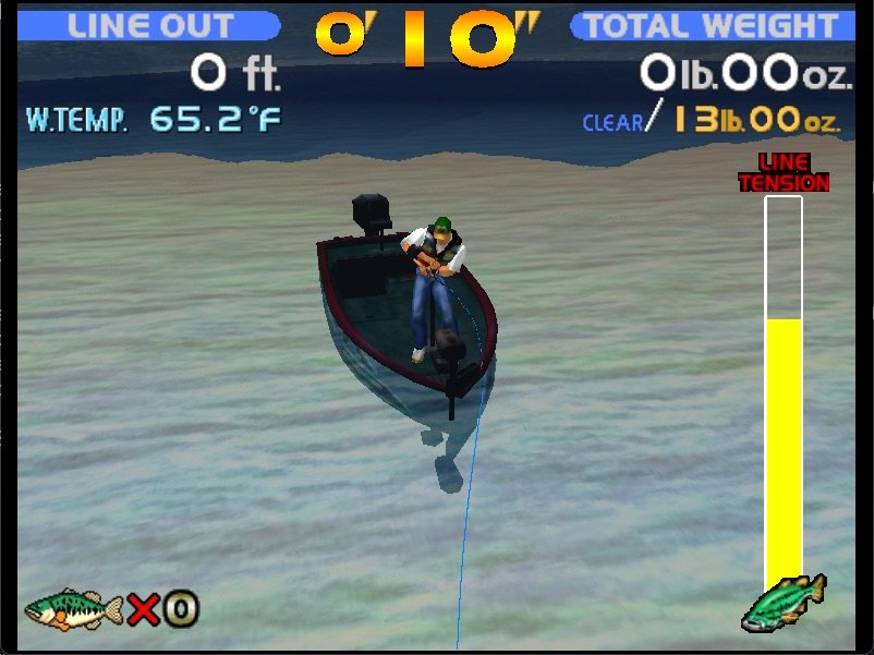 There are 3 different modes of play in the game: Arcade Mode, Original Mode, and Practice Mode. If you want the thrill of fishing without worrying about realism factors, the Arcade Mode is for you. Here your objective is to catch a given amount of bass (measured by pounds) under a strict time limit. The higher the level, the more fish you need to catch, and the shorter the time limit you are given. You can continue for as many times as you want if you fail any level, making this mode a good practice for the tournament play in the Original Mode.