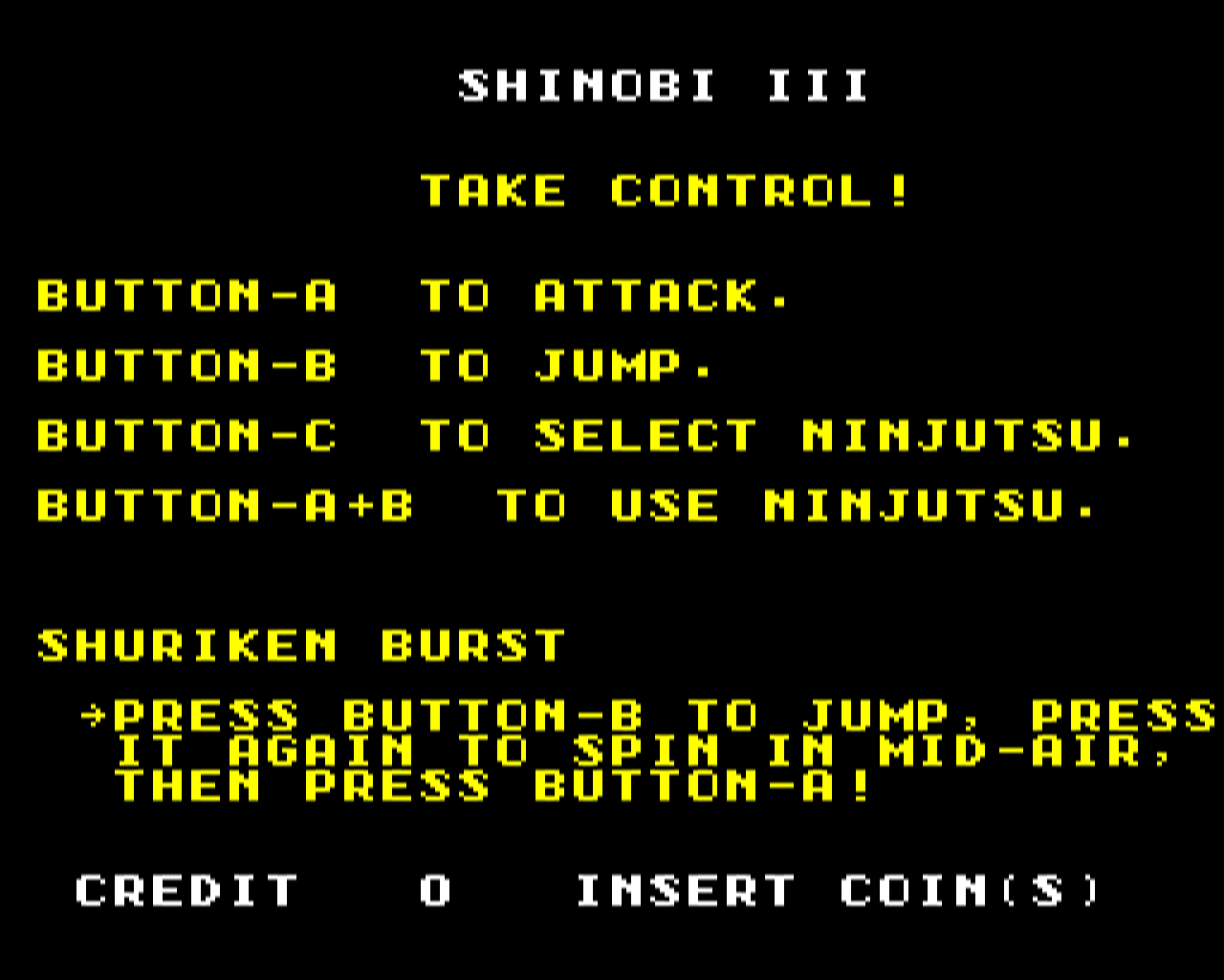 Shinobi III: Return of the Ninja Master (aka ザ・スーパー忍Ⅱ, Shinobi 3, The Super Shinobi 2) is a video game published in 1993 on Genesis by SEGA Enterprises Ltd., SEGA of America, Inc., Tec Toy Indústria de Brinquedos S.A.. It's an action game, set in a platform and ninja themes, and was also released on Arcade.