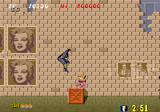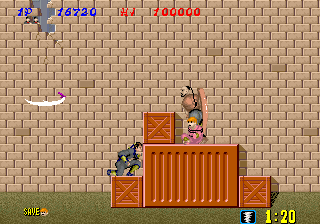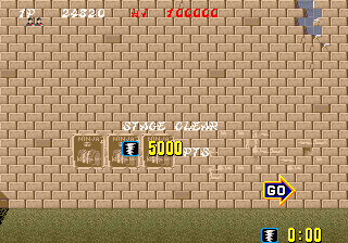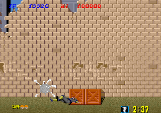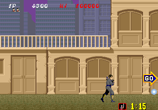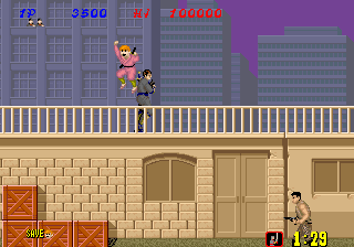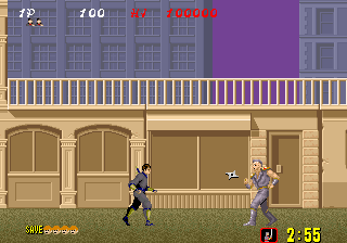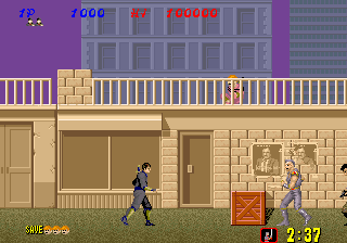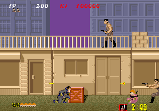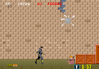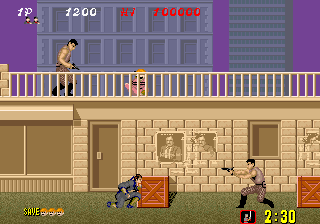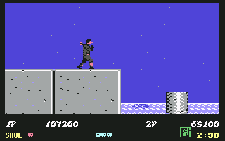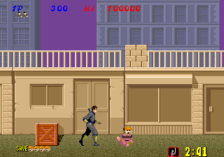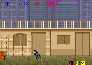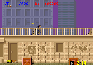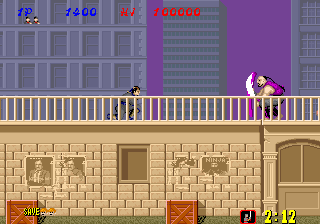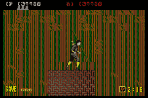 Bonus stages, which become available at the end of a level if enough hostages are rescued, are the most difficult part of the game but also arguably the most fun. You view a close platform and a distant one from a first-person perspective. You must throw shurikens at enemy ninjas in an attempt to keep them from reaching the front of the screen. If one of them gets close enough, the stage ends and you don't receive any ninja magic.