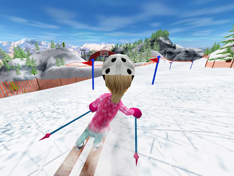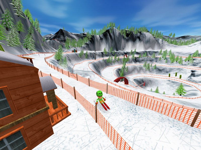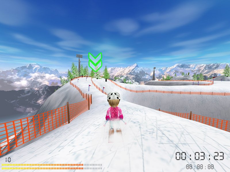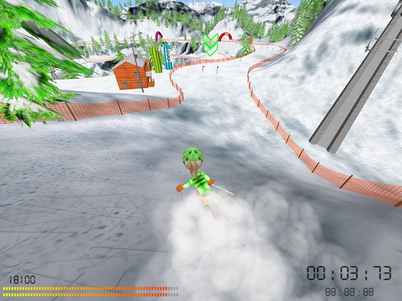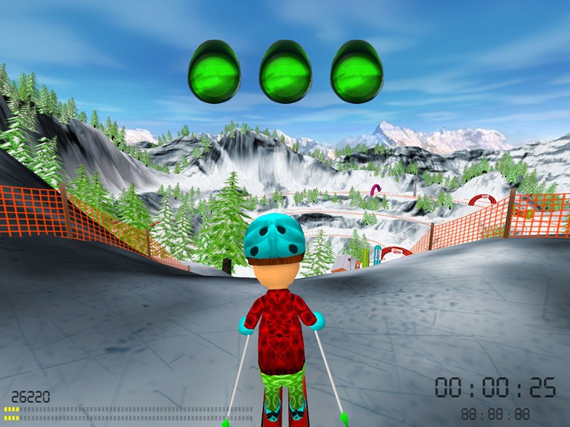Here is the video game “SKI:)”! Released in 2009 on Windows, it's still available and playable with some tinkering. It's a sports game, set in an arcade and snowboarding / skiing themes.