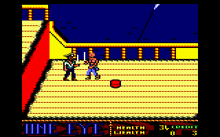 A dull pirate fencing platform game from Tengen, Skull and Crossbones is much inferior to the swordfighting sequence in Sid Meier's Pirates!, despite more detailed graphics and Caribbean scenery. Your character, the ship's captain, is blocky, and animated with very jerky movements. True, there is a few swordfighting moves you can make, but they all look quite similar anyway, and turning to face the other direction can be an exercise in frustration. The enemy pirates, with the exception of a few end-level bosses, all look the same and aren't even smart enough to move around-- sometimes they will just stack up on top of each other in one corner of the screen, looking more like bowling pins than human beings. Play this one only if you're really bored of Pirates! swordfighting, although I can't imagine why :) A disappointment, to say the least.