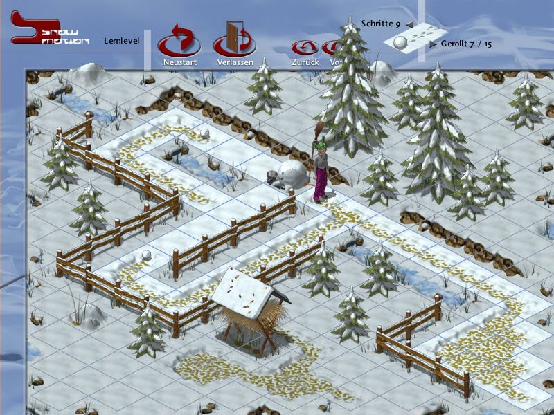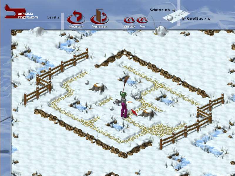 As with all good puzzle games, SnowMotion is not as simple as it sounds. Each level starts with one or more small snowballs on the ground, which you must roll onto snow-covered ground to make them bigger. If you roll a snowball anywhere that's not covered in snow (for example, a walkway), it will shrink. Since you cannot roll balls pass each other or through obstacles like fences, you must carefully calculate the optimum path to create a snowman in as few steps as possible. It's all-too-easy to get irrevocably stuck in this game, thanks to the devious level design.