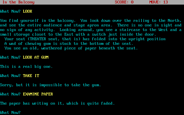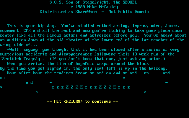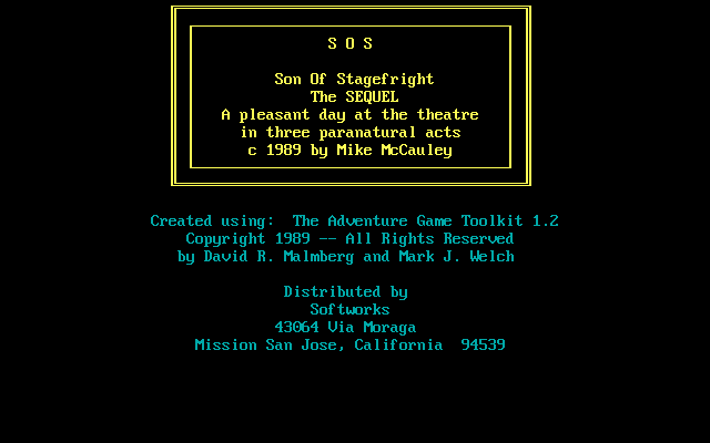Son of Stagefright is a video game published in 1993 on DOS. It's an adventure game, set in an interactive fiction and contemporary themes, and was also released on Mac.