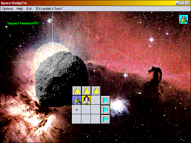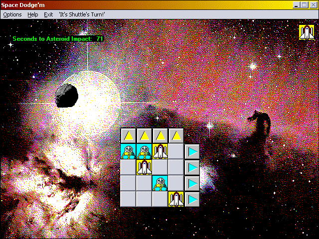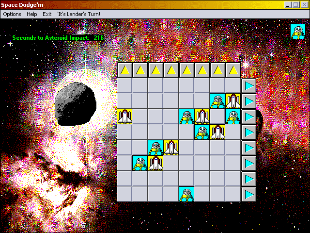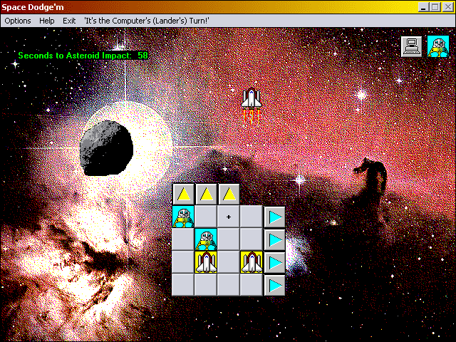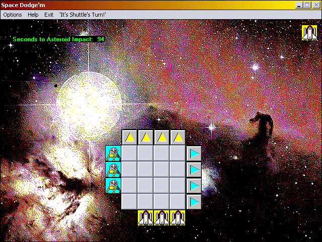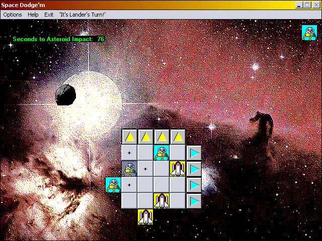 Here is the video game “Space Dodge'm”! Released in 1996 on Windows, it's still available and playable with some tinkering. It's a strategy game, set in a board / party game, sci-fi / futuristic and turn-based themes and it was released on Windows 3.x as well.