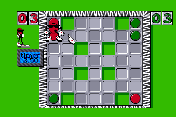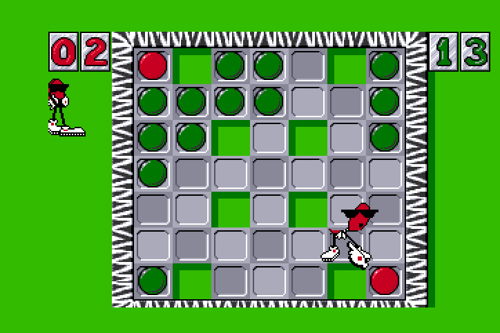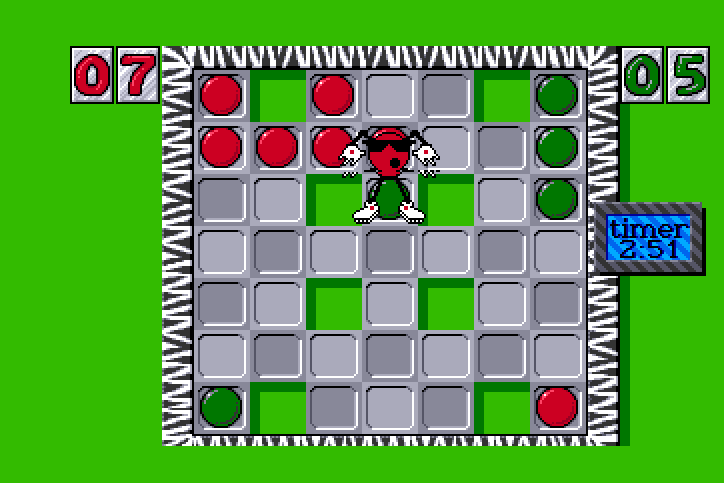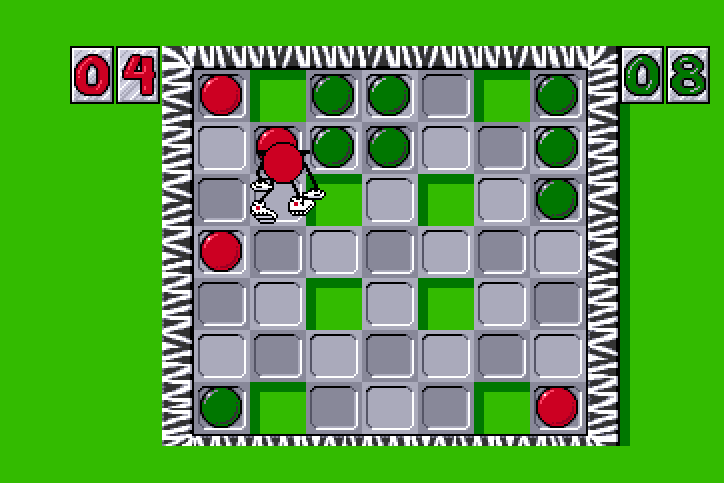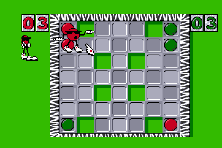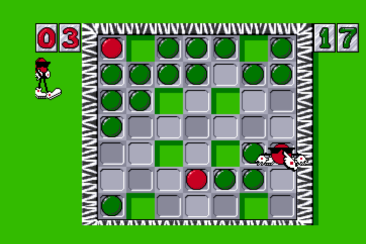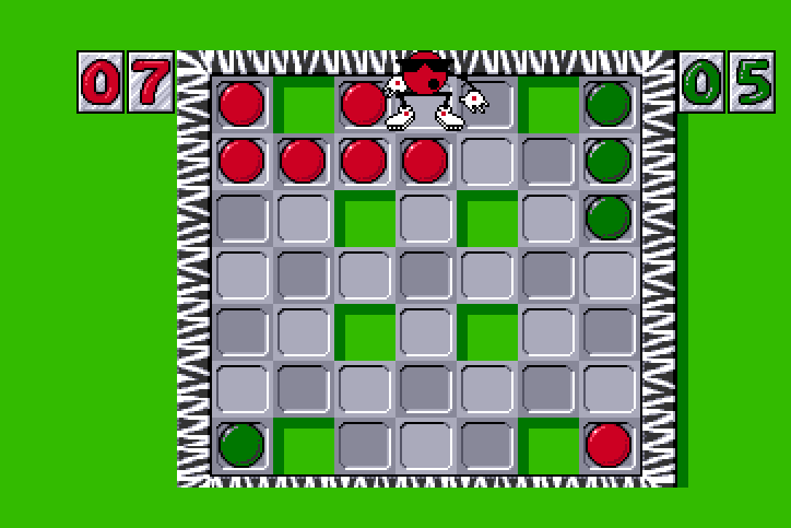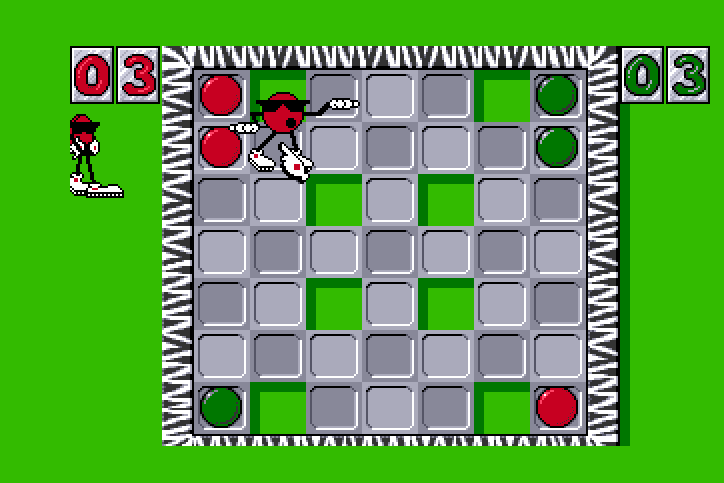 Spot is a fun Othello-style game starring 7Up's Spot character. In this board game for one or two players, your objective is to occupy as many tiles as possible by placing your pieces on the board. You can either move one or two spaces at a time. When you move one space, your piece will multiply itself into the new tile; jumping two spaces means simply moving your piece. Whenever you land on a tile next to your opponent, all his/her adjacent pieces become yours, changing to your color. The pieces morph into 7Up mascot when you move them, but that's about the extent of using this licensed. The computer AI is decent, and offers a good challenge.