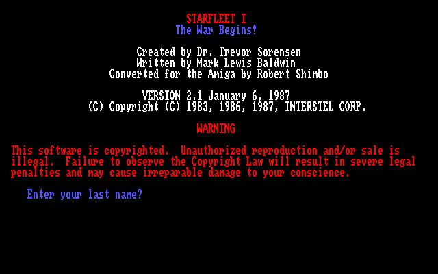 In a plot and gameplay inspired by Star Trek games that were floating around almost every mini-computer and mainframes in late 1970s, Star Fleet lets you command a spaceship and undertake various missions to defend the earth from the aliens Krellan and Zaldron. Every ship system is modeled in meticulous detail-- a must play for all every armchair commander. The version of the game here is the first official release version by Interstel, after it was incorporated by Trevor Sorensen in 1986. The game itself, however, began selling as early as 1981 by Cygnus, back when it was still a "garage sale" operation.