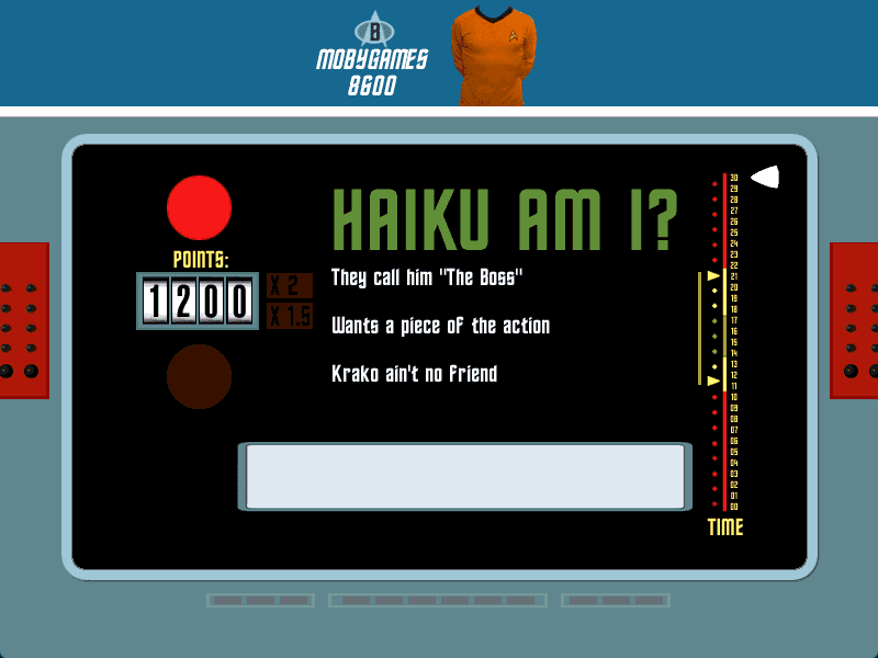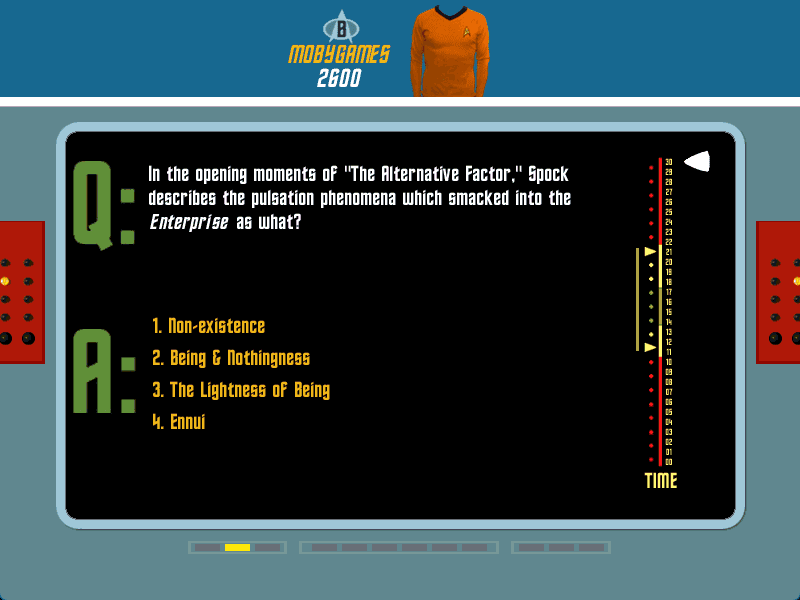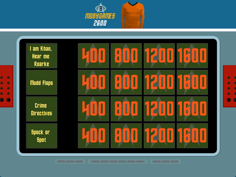In 1999, Sound Source Interactive, Inc. publishes Star Trek Trivia Challenge on Windows. This puzzle game is now abandonware and is set in a game show / trivia / quiz, sci-fi / futuristic and licensed title themes.