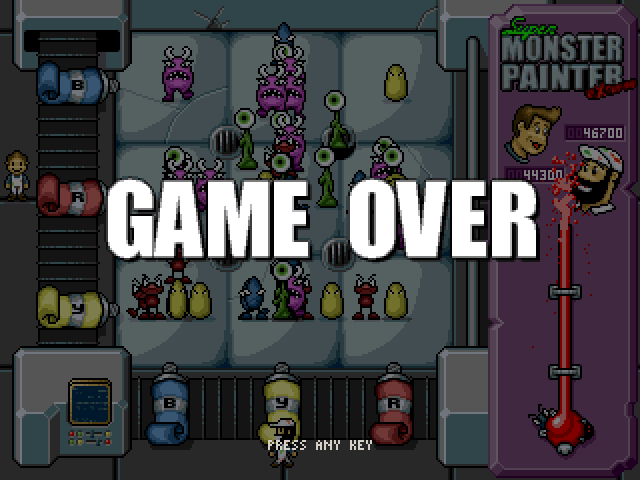 Super Monster Painter Extreme is yet another addictive cartoony arcade game from Johan Peitz of Free Lunch Design, maker of a great freeware classic called Icy Tower. In the author's words, this is "...[a] game which revolves around colors in general and mixing in particular. It can be played by one or two players. One player controls the horizontal painter and the other controls the vertical one. Hit fire to make the painter jump up on the tube and squirt color into the room. Monsters who inhabit the room have different colors. If they are hit by paint of correct color they die. As the game progresses, more monsters will come up through the gratings. In later stages these will have a mixed color from the beginning. Sooner or later the player(s) won't be able to keep up and the room will be filled with monsters. Before it happens, make sure you make proper use of the powerups you're given in order to maximize your score. The game has a soundtrack whose intensity matches the tension."