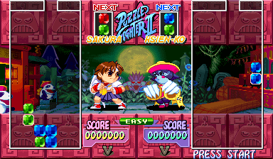 The Street Fighters aren't completely idle while all this is going on - when counter gems drop onto your opponent's screen, your fighter will attack or taunt them. If you drop below ten gems, your fighter will taunt your opponent. Get ten to thirty counter gems, and your fighter will use a special move on your opponent - get thirty or above, and they'll use a super move, which is a great way to rub your opponent's nose in it. There are lots of different modes to play in - Arcade, Original, Master Arcade, and Super Puzzle Mode. Choosing Super Puzzle Mode lets you challenge various super-hard computer opponents, in return for a secret item. These items include the codes to find the hidden fighters, a sound test, some pictures of the fighters, and even a particularly dire Japanese song. Plus you can fiddle with the difficulty and other options, and challenge someone over a network.