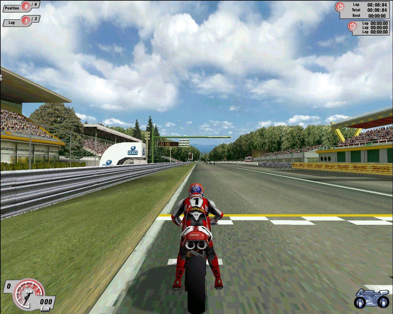 The inevitable downside of this is Superbike requires a ninja PC to look its best. On a PIII-500 and TNT1, it would only settle at 800x600 with the options turned down. A GeForce is really where the action is at, allowing flawless draw distance and consistent frame rate at high resolution, even at crowded moments like the always-hectic first corner.