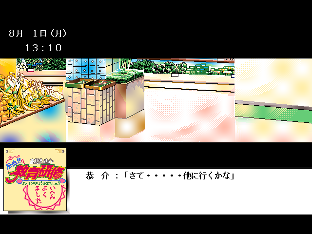 Takamizawa Kyōsuke Nekketsu!! Kyōiku Kenshū (aka 高見沢恭介 熱血!!教育研修) is a video game published in 1995 on FM Towns by ZyX Inc.. It's an adventure game, set in an adult and anime / manga themes.