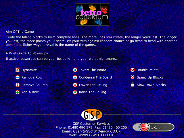 In 1999, GSP Software publishes Tetro Conektum on Windows. This action and puzzle game is now abandonware and is set in a falling block puzzle theme.