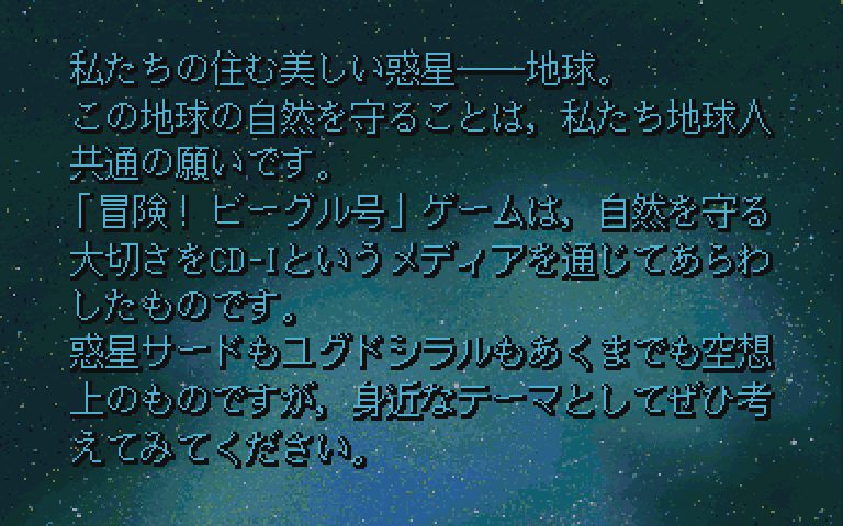1990, the year The Adventure of the Space Ship Beagle was released on CD-i. Made and self published by Denshi Media Services Co., Ltd., this action game is available for free on this page.