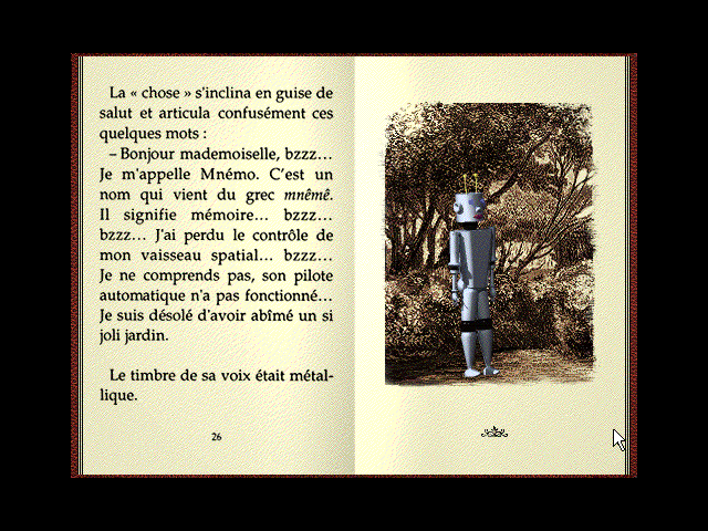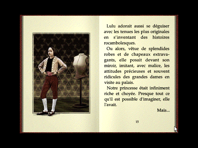 Lulu reaches emotions other CDs leave untouched. There is sentiment here on a scale few English-speaking authors would even dare to attempt. Visually, it is exquisite. It has wonderful haunting music (by Olivier Pryszlak). But that is not where the magic begins. In fact, "Lulu" is not a book. It is a play on the whole idea of books, the people who live in them, and the deep, yet impossible attachments we form with them - especially as children. There is no "real" Book of Lulu (and Victor-Pujebet insists there never will be). Lulu's world only exists when the computer is on, and you are separated from it by the thick glass of your monitor screen. You cannot put it into your pocket and imagine you possess it. That is Romain's whole point: we can never possess the things and people we love. The story goes like this: