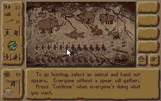 After you start a new game, you can choose between six different routes to lead your tribe to safety, each successive one more difficult than the last. The game uses a very user-friendly interface, and it doesn't take to long to understand what each icon represents. In the middle of the screen is the map, comprising hexagonal tiles similar to turn-based wargames. Your position is marked by the hexagon icon marked with two tribesmen, and the yellow areas are the places you can travel to (you can only travel one square at a time). The left menu column shows your tribe's status, including how many days you have left until winter, the contentment level of the tribe, the amount of food supplies, number of spears, and spear/hunting ability. The right menu column is where you choose what to do during that turn, e.g. hunting, practice spear throwing, rest, and worship (religious) idol. Clicking on the last icon brings up an excellent on-line survival guide, which is packed with information regarding everything you'll need to know including the profiles of the tribe, hunting instructions, and the landscape and its conditions. The action icons also change according to what you are doing. Click on one of the yellow hexagons, for example, and you can choose whether to travel slowly or quickly, or to send a scout party ahead. You will also face random events, which require you to make a decision from several possibilities, similar to the multiple-choice questions in Interplay's Castles.