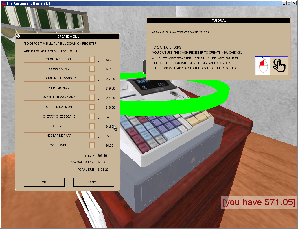 Here is the video game “The Restaurant Game”! Released in 2007 on Windows, it's still available and playable with some tinkering. It's a simulation game, set in a managerial and real-time themes and it was released on Mac as well.
