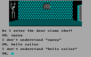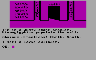 While the graphics are quite good at the time, the parser is quite primitive - only simple verb+noun constructs such as GET HAT are understood, and some verbs that are common in IF games such as SEARCH are not always recognized. Fortunately, the games make up for primitive parser with well-written plot, fun characters, and some clever puzzles. The plot of The Vortex Factor: "What is it? What secrets does it hold? The seeker of treasures through time and space must find out! From the coliseum of ancient Rome to the futuristic world of tomorrow ... join us in this unforgettable odyssey."