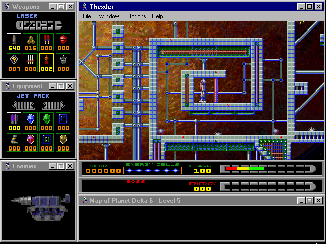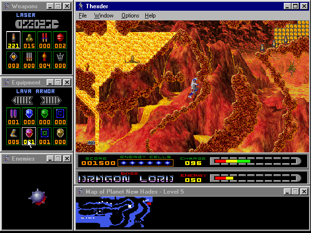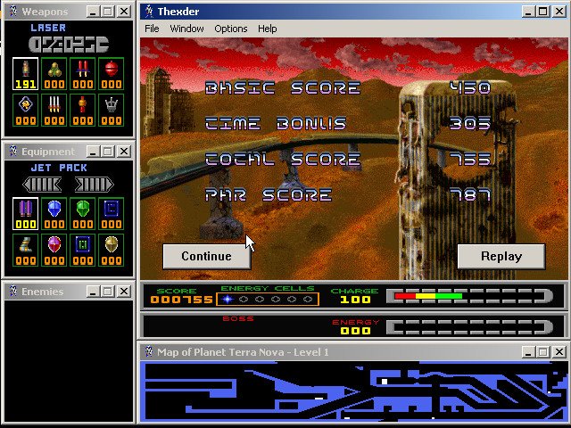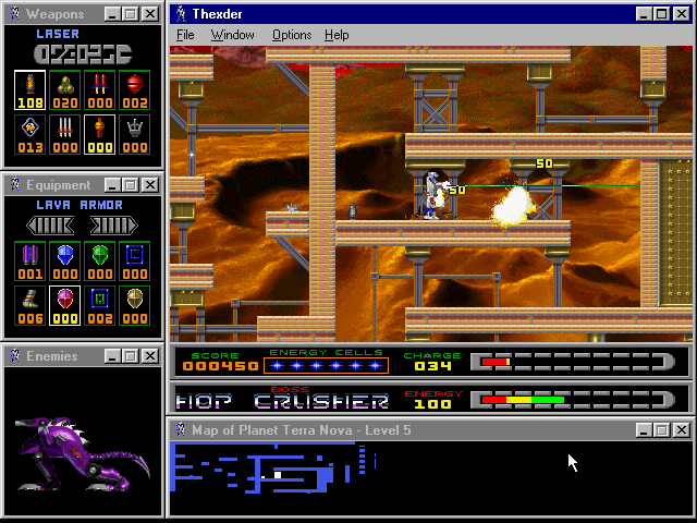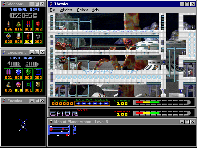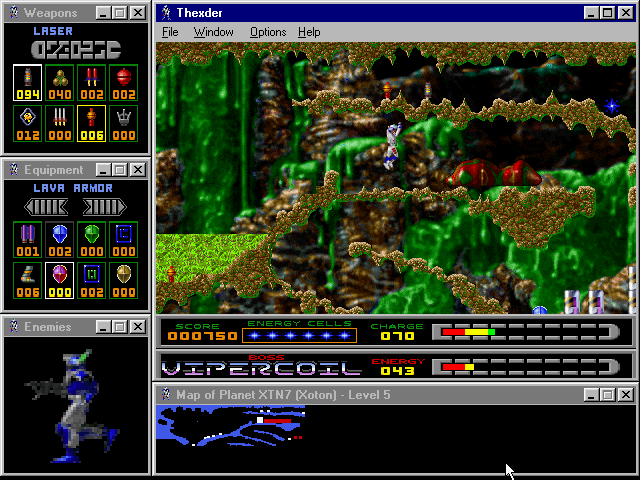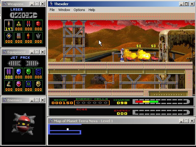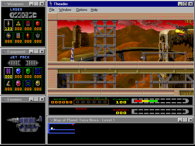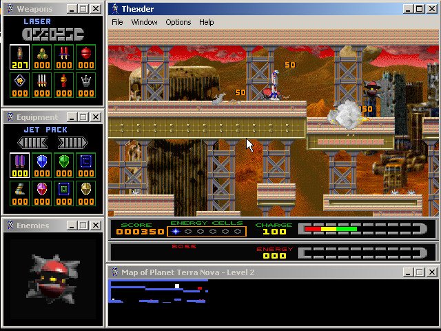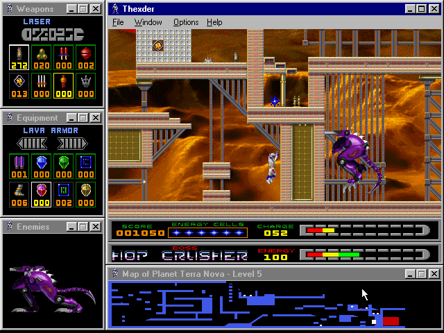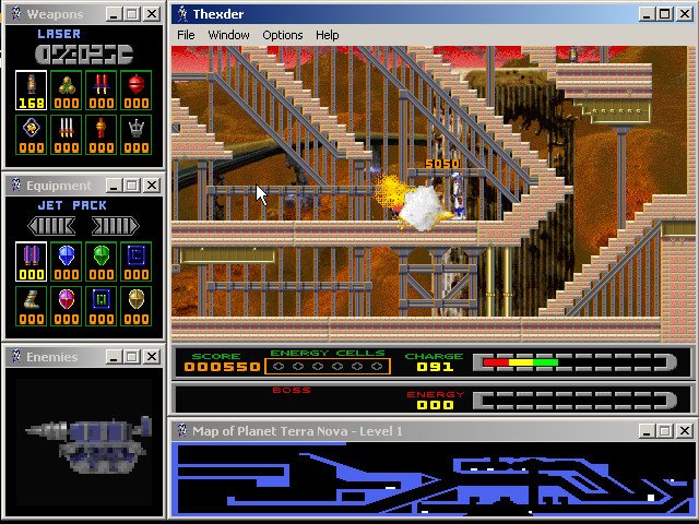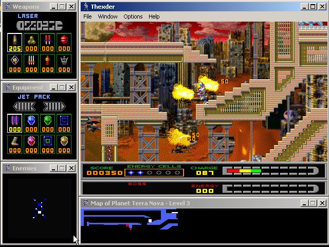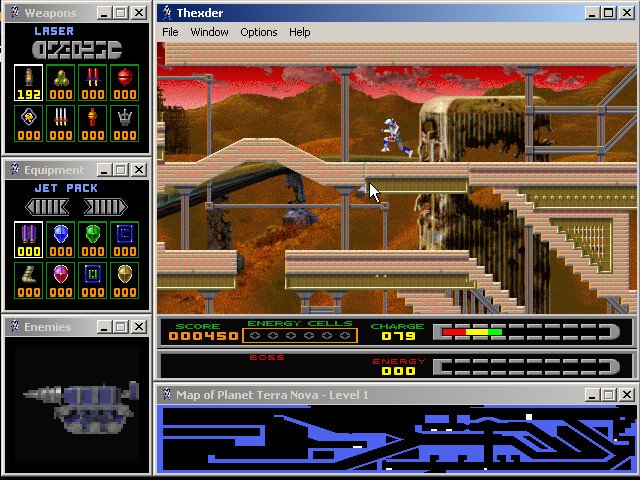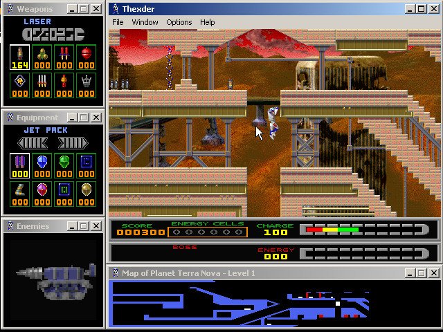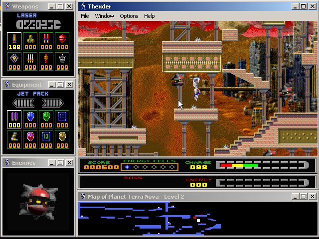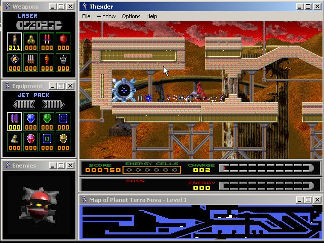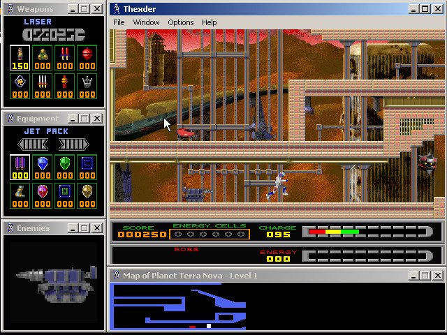 Fans of the original Thexder will be delighted by sharp SVGA graphics, excellent multiplayer support (modem, IPX, and TCP/IP), and a very good interface that lets you see the level map, enemy status, weapon selection, and available equipment at all times via small display windows that surround the main screen. The digital speech and MIDI music are nice, although the cutscenes and animations could be much better. If you enjoyed the 1987 original and/or its sequel, you will have a lot of fun with this modern version. If you have never played the original, this version ranks as one of the better platformers you will come across. It is neither as fun nor as smooth as, say, Abuse, but it is still very enjoyable. Two thumbs up!