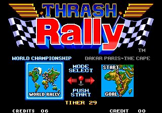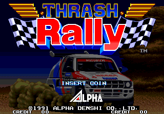 Thrash Rally is a video game published in 1991 on Neo Geo by SNK Corporation, SNK Corporation of America. It's a racing / driving game, set in an automobile, africa and europe themes, and was also released on Arcade and Neo Geo CD.