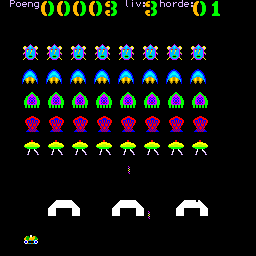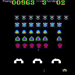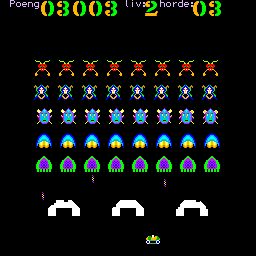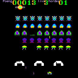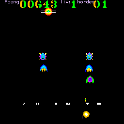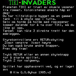 Tiki Invaders is a video game published in 1985 on Tiki 100 by Tiki Data AS. It's an action game, set in an arcade, sci-fi / futuristic and shooter themes.