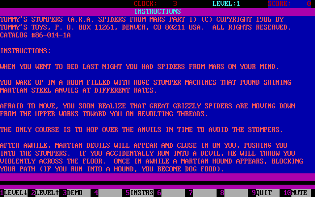 Tommy's Stompers (aka Spiders From Mars: Part I) is a video game published in 1986 on DOS by Tommy's Toys. It's an action game, set in an arcade theme.