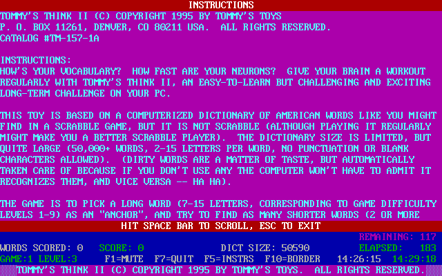 Share your gamer memories, help others to run the game or comment anything you'd like. If you have trouble to run Tommy's Think II, read the abandonware guide first!