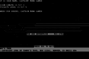 Part of the Tommy's Toys series of "inspired-by" shareware games, this their version of the classic ASCII Star Trek game.