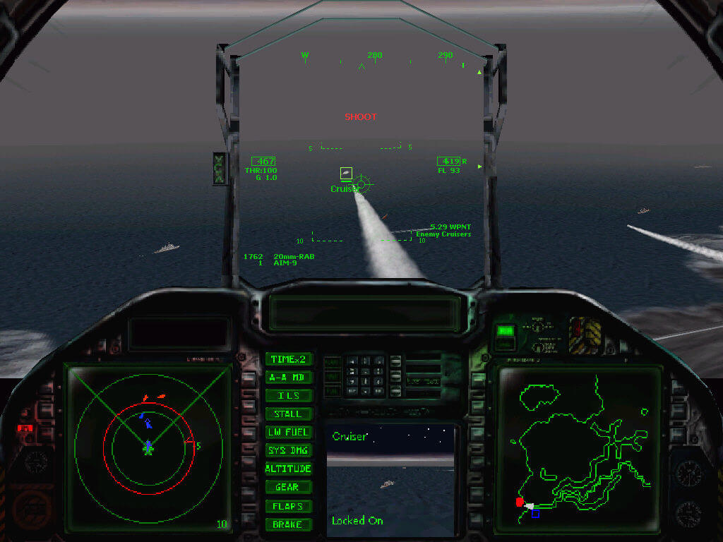 The arcade feel is also thrust in your face with the choice of viewing modes. You can fly in a virtual cockpit, using your joystick hat to look around, or you can play in a more X-Wing style mode with a full screen view, or you can play from a chase view where sub-windows are superimposed to let you see your MFD's. I found the conventional in-cockpit mode to be the best, but then I also play racing games from in-seat rather than chase views. The MFD's are what you'd expect - showing damage, radar, weapon loadouts and maps of the area. Toggling weapons and weapons modes is very easy, the only reason to visit your keyboard in a hurry is to hit chaff and flares. With a tight maneuver and judicious use of the counter-measures key it's quite easy, perhaps too easy, to evade inbound missiles. One game option even allows chaff and flares to be automatically launched for you.