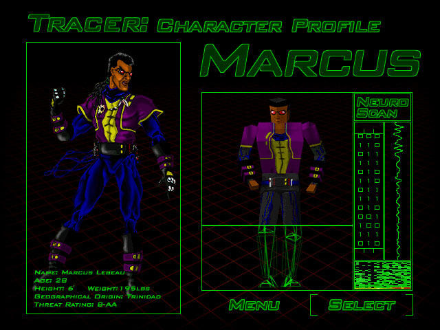 As ever, the game opens with a lengthy FMV sequence just to get you into the mood. Once you've set up your controls, tweaked the graphical and audio settings to your liking you can select a virtual persona which represents you in cyberspace, as far as I can see the differences are purely cosmetic, but it at least lets you choose an on-screen persona appropriate to your gender, or even the opposite, should you so wish. The characters are rendered in textured polygons and are apparently motion-captured. They are nicely animated and if left alone for long enough will amuse themselves by doing back-flips, stretching, or even doing a little Highland dance.