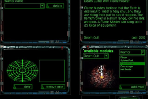 The modules are broken up into two types, weapons and equipment. Equipment ranges from sensor turret, heavy vehicle chassises, and super power charges for vehicles. While Warriors can load up on a range of items from cloaks, personal shields, and armor. The impressive thing is, the complete lists for these modules are quite huge and offer players of each tribe quite a variety. The thing that struck me as I created new units was that the game reminded me of an old favorite boardgame I played, called Steve Jackson's Car Wars. Many modules like light and heavy chassis super powerplants and oil dropper all sent me reeling back in nostalgia. The game even models limited slots (accounting for space restrictions), weight limits, and acceleration factors, much like the board game did (just in case you thought I was talking about that pitiful attempt to the PC in 1990).