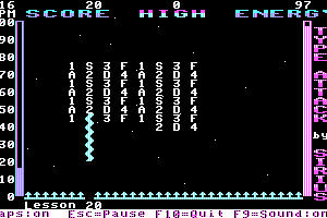 Here is the video game “Type Attack”! Released in 1983 on DOS, it's still available and playable with some tinkering. It's an educational game, set in a sci-fi / futuristic and typing themes and it was released on Commodore 64 and VIC-20 as well.