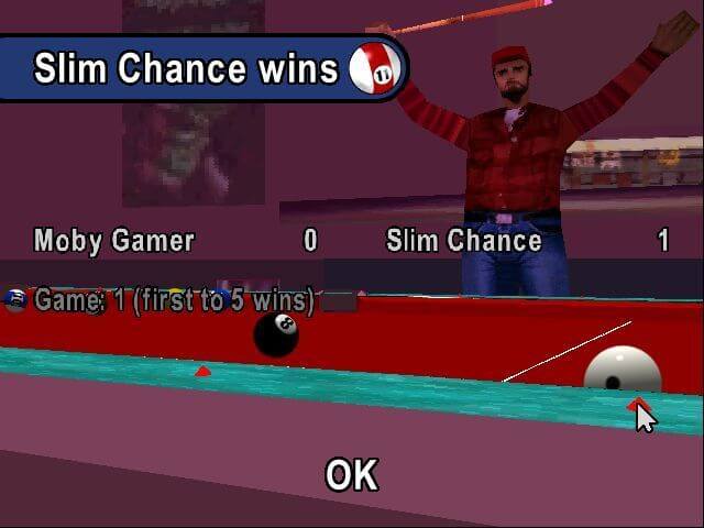 Ultimate 8 Ball (aka Actua Pool, Pool:shark) is a video game published in 1999 on Windows by Dice Multi Media Europe B.V., THQ Inc., Gremlin Interactive Limited, Urbanscan Limited, ZOO Digital Publishing Ltd., Zushi Games Ltd.. It's a sports game, set in a pool / snooker theme.