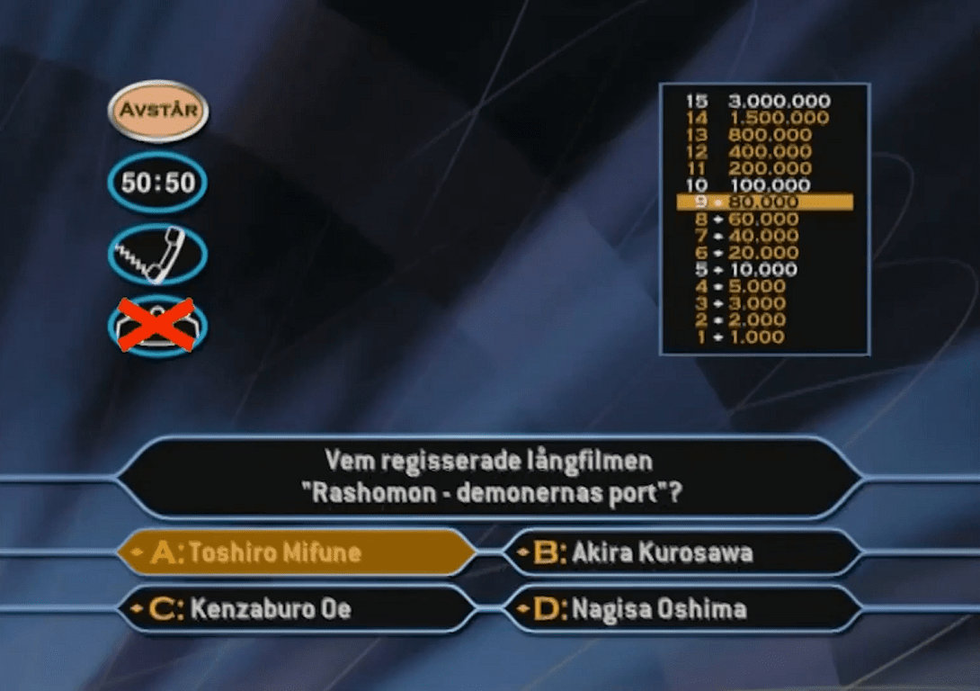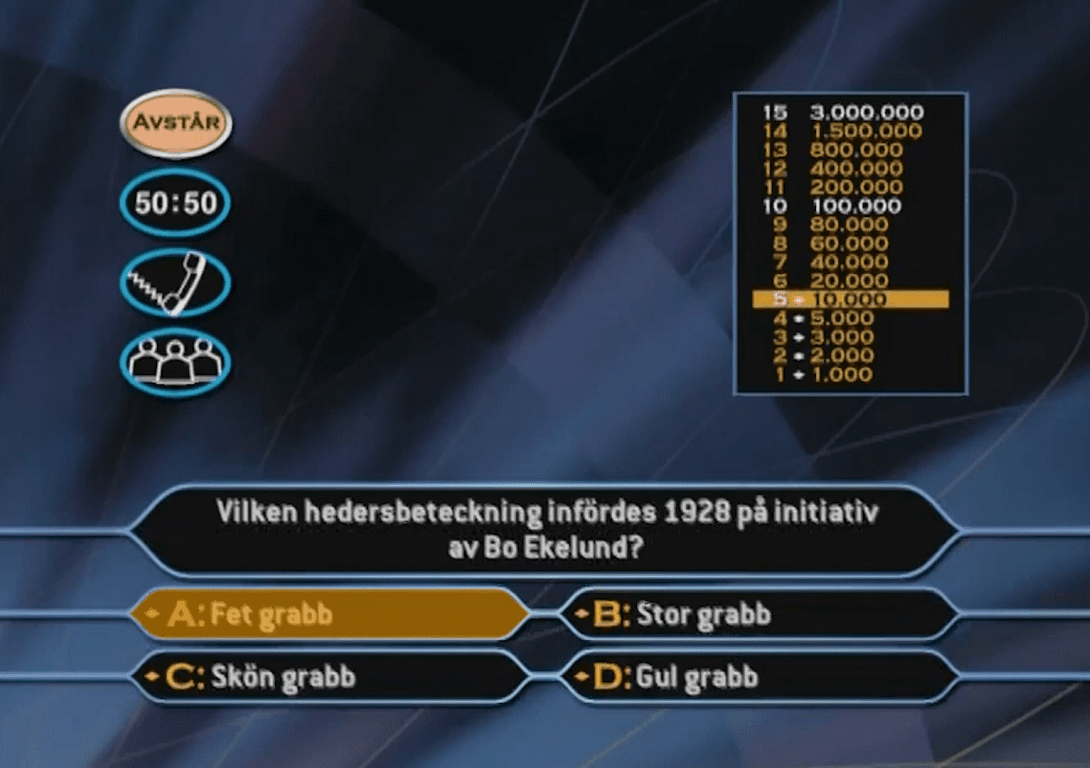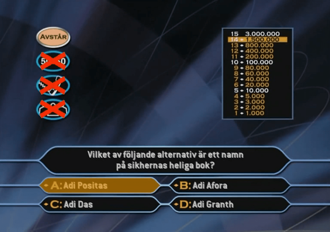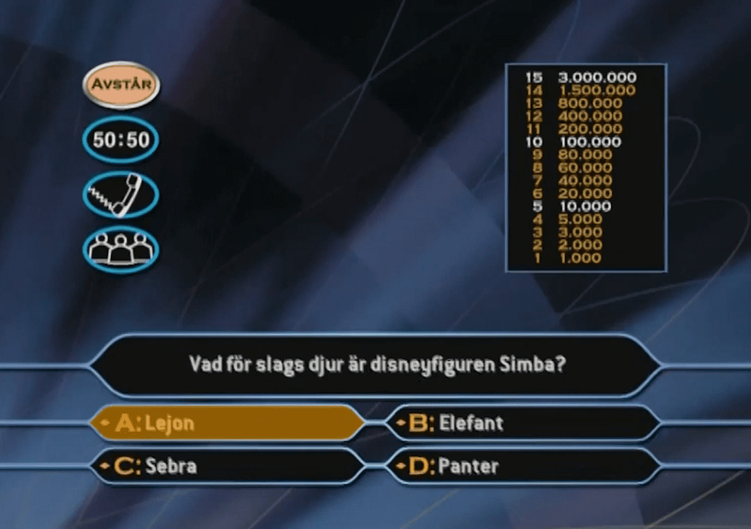 Vem vill bli miljonär (aka Wer wird Millionär) is a video game published in 2004 on DVD Player by ZOO Digital Publishing Ltd.. It's a strategy game, set in a game show / trivia / quiz, meditative / zen, licensed title, contemporary and full motion video themes.