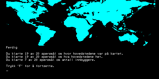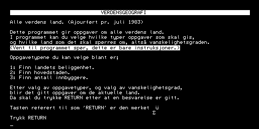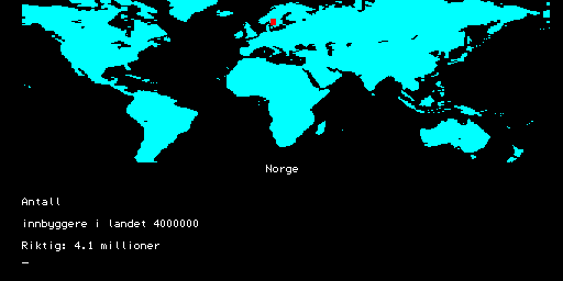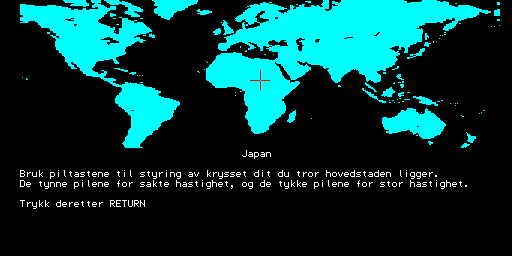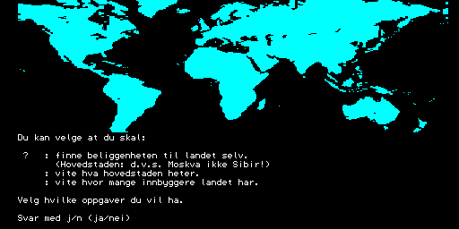 Here is the video game “Verdensgeografi”! Released in 1984 on Tiki 100, it's still available and playable with some tinkering. It's an educational game, set in a game show / trivia / quiz and geography themes.